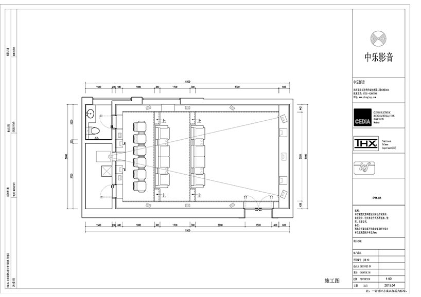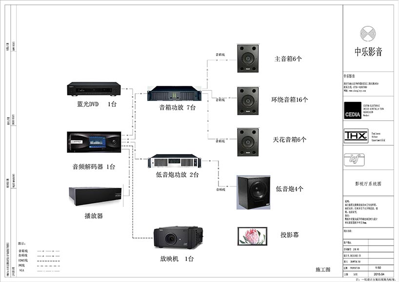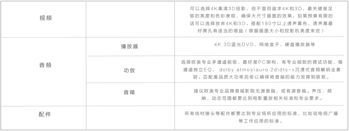 專業級的家庭影院對聲學環境有較高的要求,需要獨立房間,長寬比例需遵循聲學要求,為確保影院效果,建議房間面積約為25m2--80m2,層高為3m以上 。